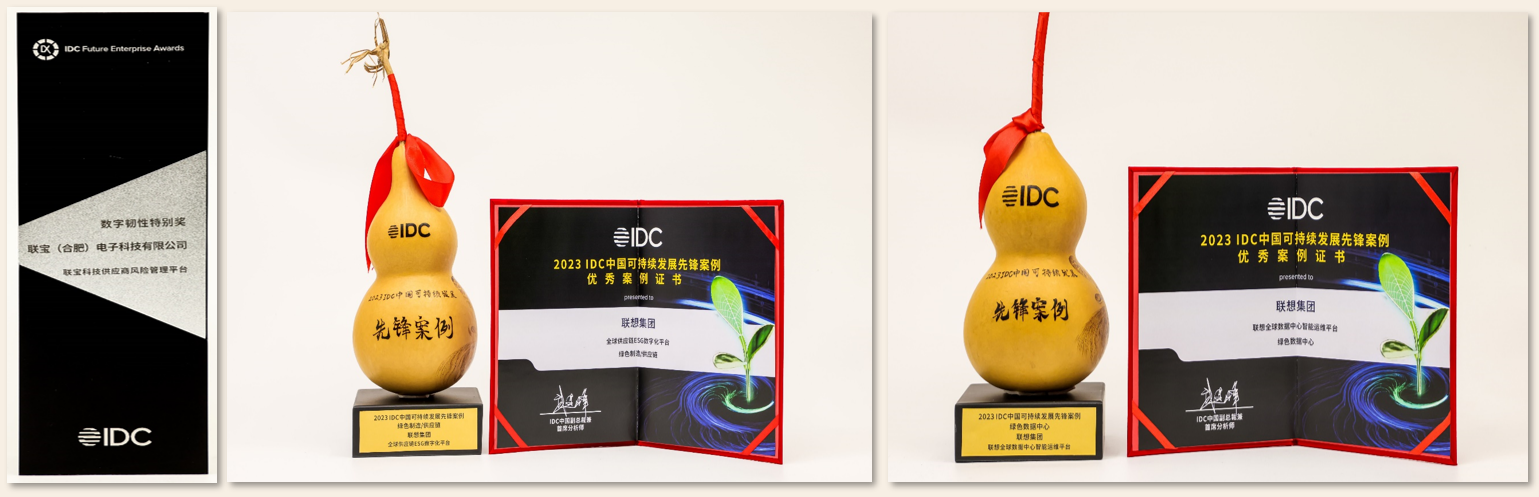 图 | 从左至右:IDC中国未来企业大奖—数字韧性奖、、、、IDC中国可持续发展先锋案例—优秀案例